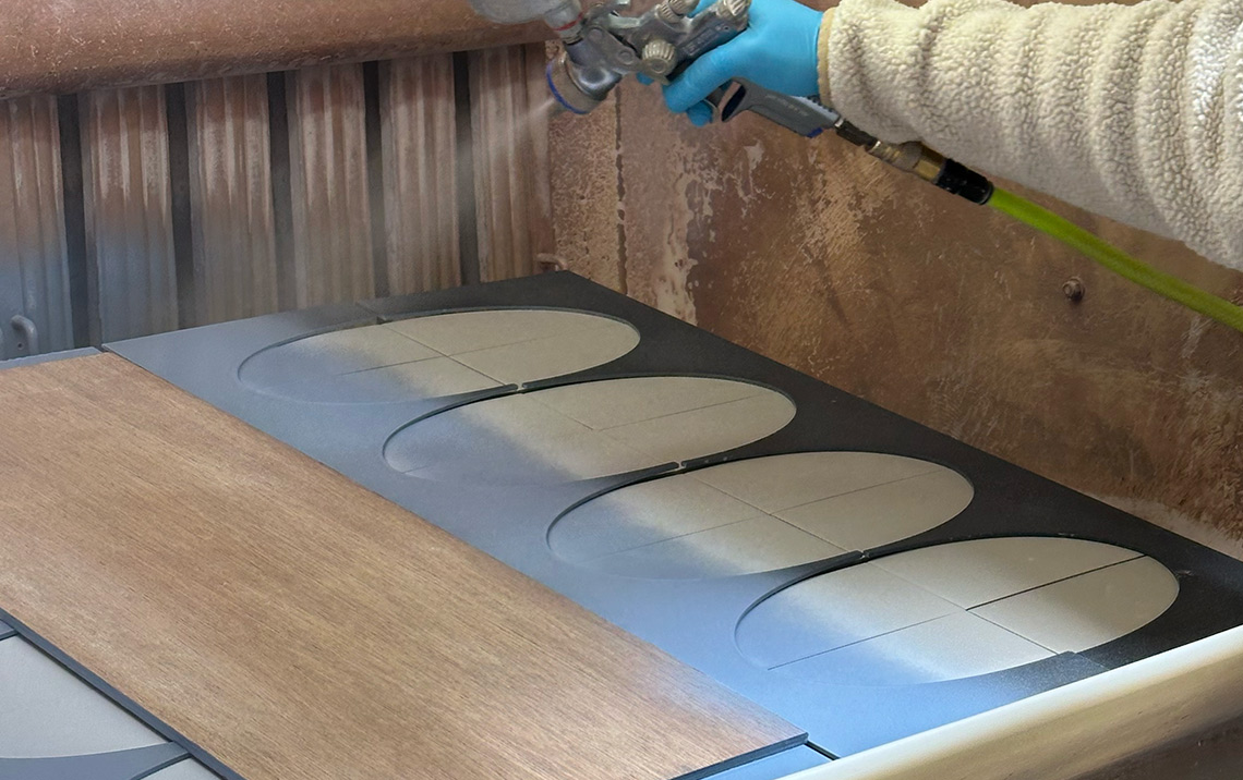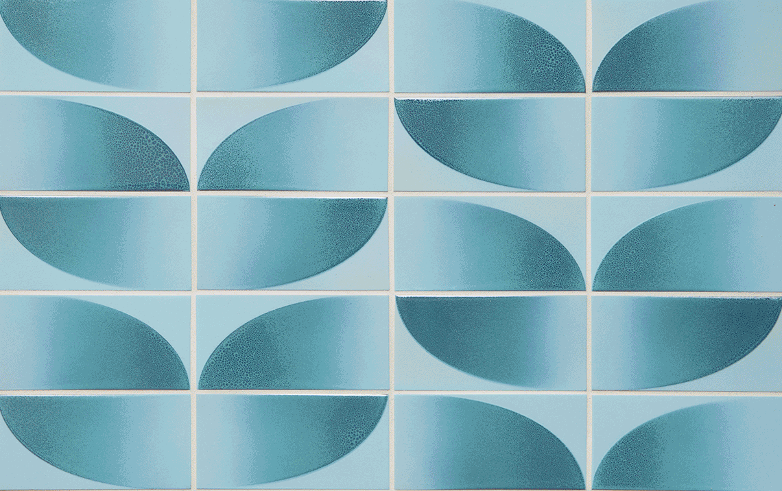 Essentially, Arc tiles are made by applying several layers of glaze using a combination of stenciling and a fade technique. When two glazes are layered, it can create a really special and interesting “third zone” where the two glazes interact. All of Heath’s glazes are applied and sprayed by hand, but it takes a truly skilled hand to achieve the smooth fade you see on Arc tile—it’s a real testament to the expertise of our glazing team. There are a host of other important steps in setting up tooling, working with multiple glazes, and the high-touch fade technique that make Arc a high-craft offering—and that’s not even going into forming and firing!