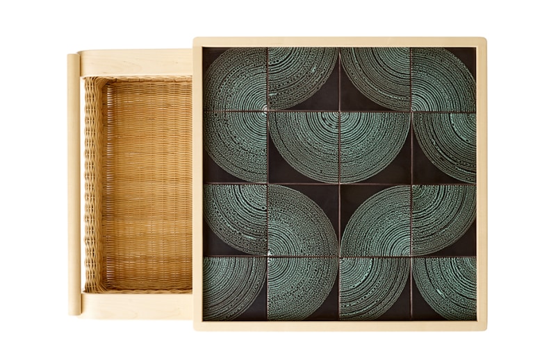 Designed in 1937 by Alvar Aalto, the Tea Trolley 900 is a distinctive, functional, and versatile marriage of material and form: the circular wheels and square top, the richness of the Finnish birch wood, and the woven basket. With typical emphasis on the wheel, we excitedly went to the top, highlighting an area that celebrates something we know very well: ceramic tile. Of course!