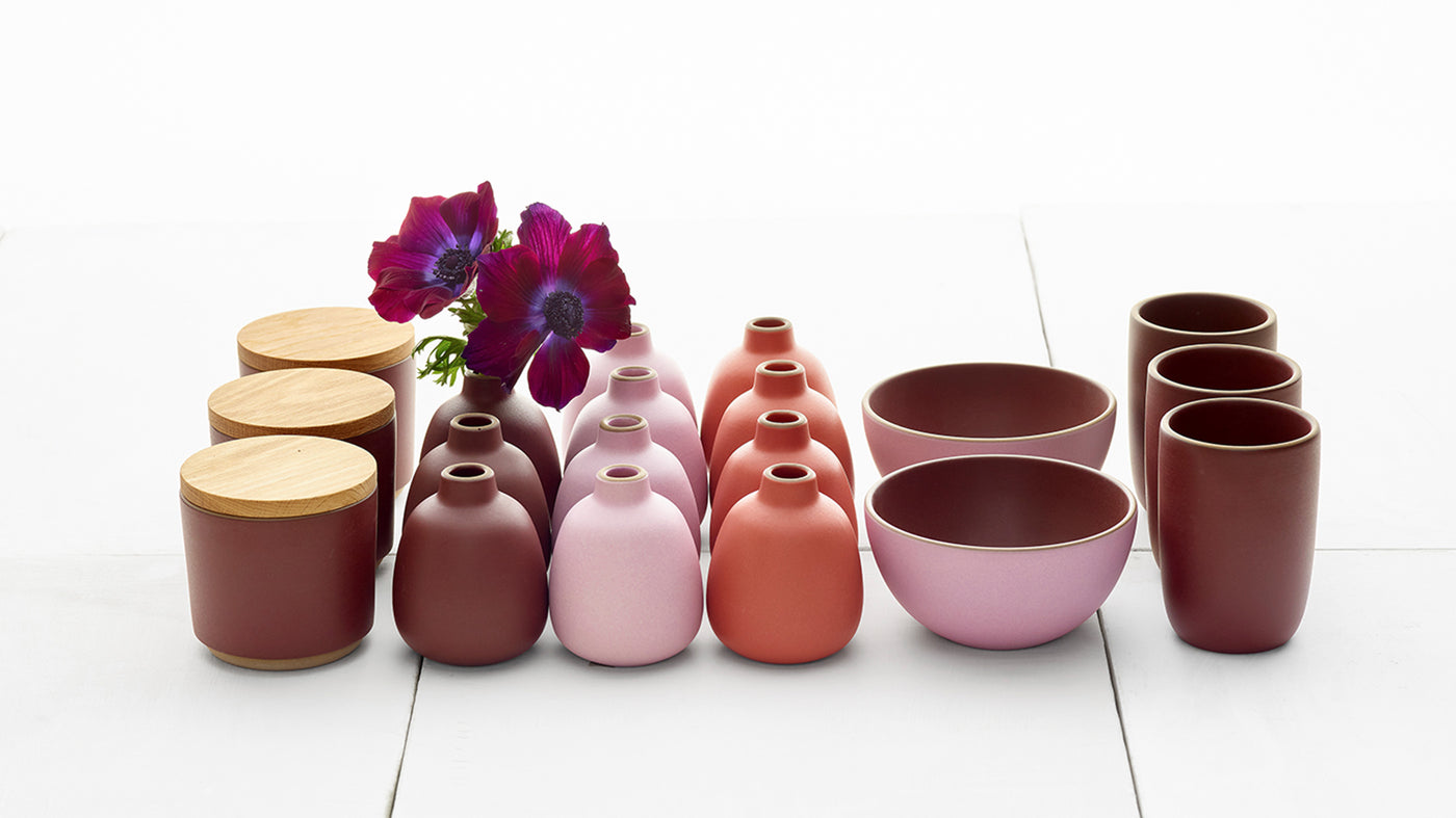 This season’s palette is warm, ripe, and full-bodied. Think fruits and flowers in saturated hues: pink Wildflower, red/orange Zinnia, and deep Black Plum. Our special technique glazes, Sorbet and Sunset Fade, have a color gradient with a frosty finish. Each is comprised of a matte and glossy glaze, creating multiple colors, textures, and opacities. When creating these two glazes, we didn’t start from a sketch. The glaze chemistry simply surprised and intrigued us along the way; For us, the process is the inspiration. The seasonal collections are our time to experiment, take risks, and share our take on a color palette that feels fresh and exciting.