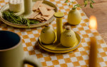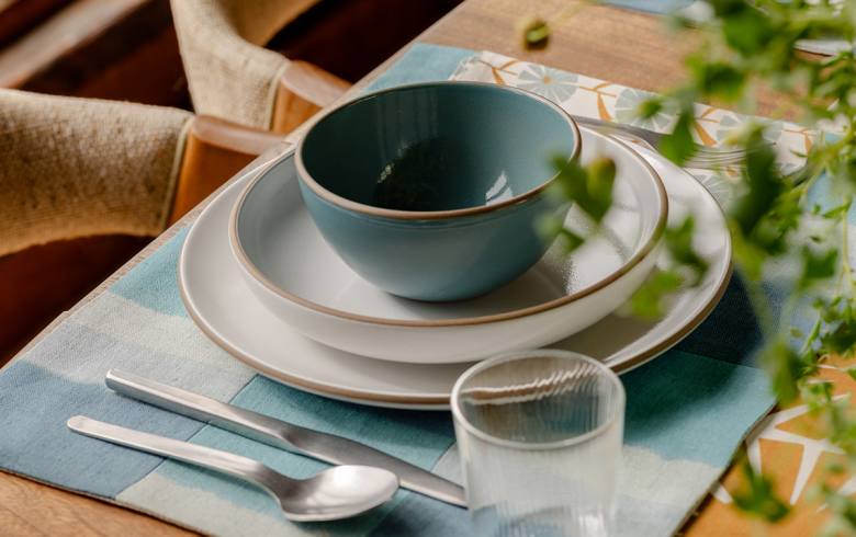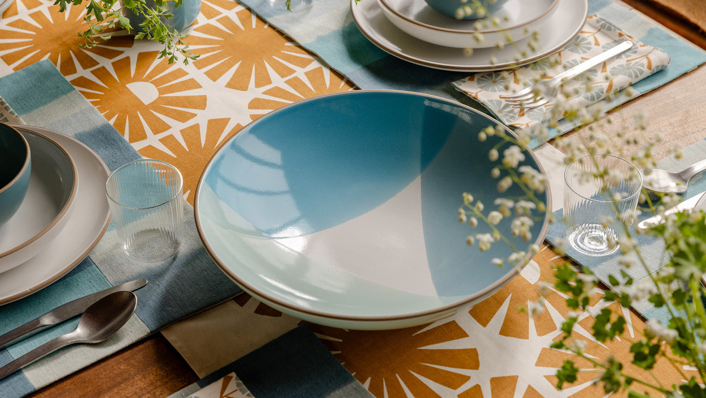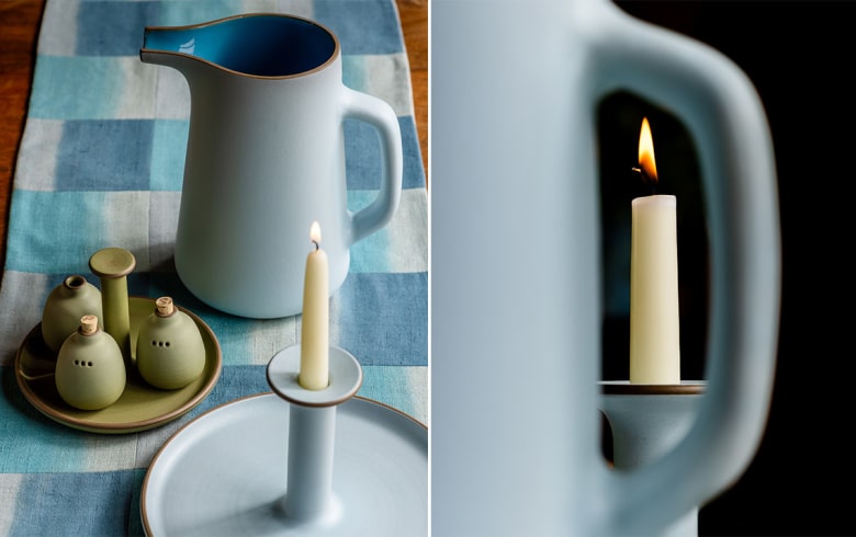 Evoking a quiet walk on a crisp winter morning—clouds floating lazily in an azure sky; half-frozen grass crackling under your feet—this season’s palette balances icy blues and whites with warmer, earth-toned glazes like Turmeric, Pesto, and Lemongrass.