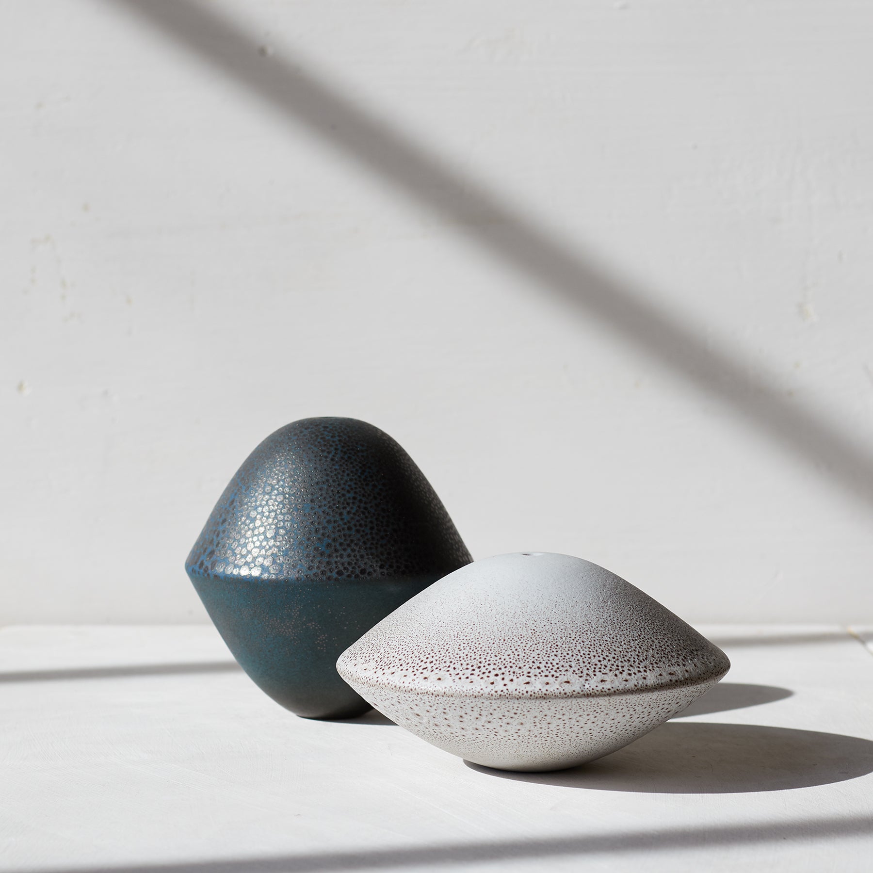 Supremely elegant and otherworldly. Inside each sculpture is a small ceramic bead. Pick up the piece, gently shake, and allow the twinkling sound to remind you of something you don’t want to forget. This pair—one tall and stout the other short and wide—are like two objects caught in each other's orbit: both different but also inseparable. The surfaces are glazed in opposing matte shades dark and light with mottled textures reminiscent of organic objects. A beauty resulting from years of glaze research from Design Series' past.