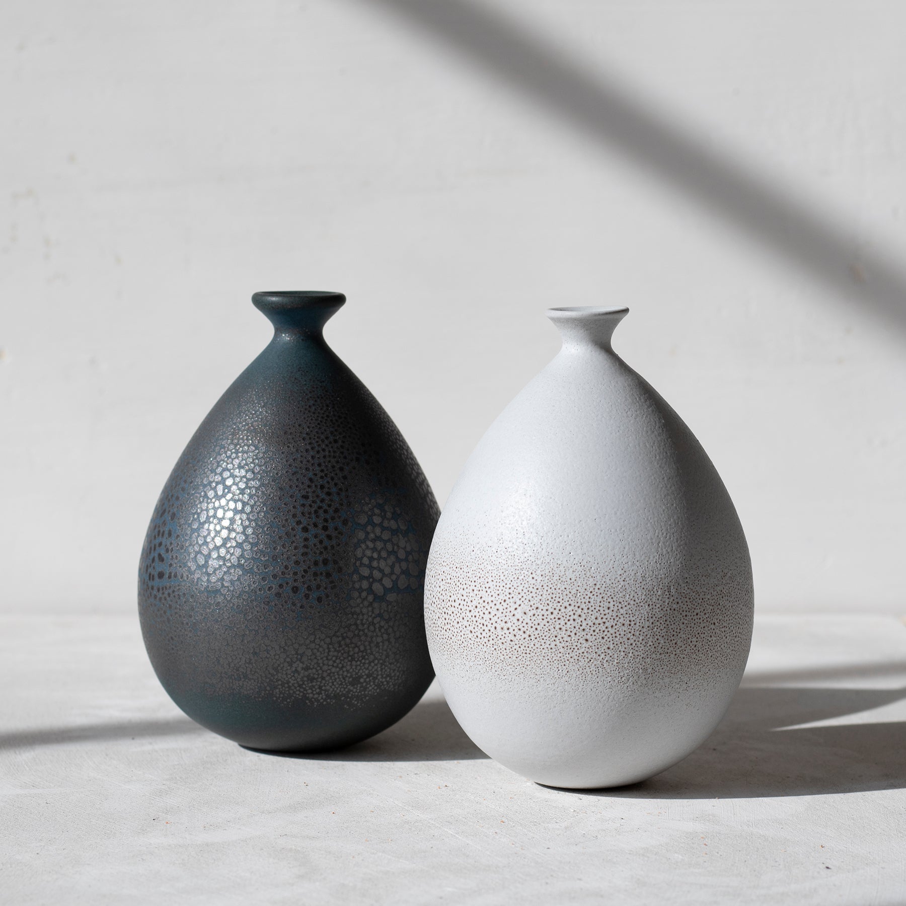 A pair reminiscent of classical bottles with tension from the extreme change in the curve of the profile. Inside each sculpture is a small ceramic bead. Pick up the piece, gently shake, and allow the twinkling sound to remind you of something you don’t want to forget. The surfaces are glazed in opposing matte shades dark and light with mottled textures reminiscent of organic objects. A beauty resulting from years of glaze research from Design Series' past.