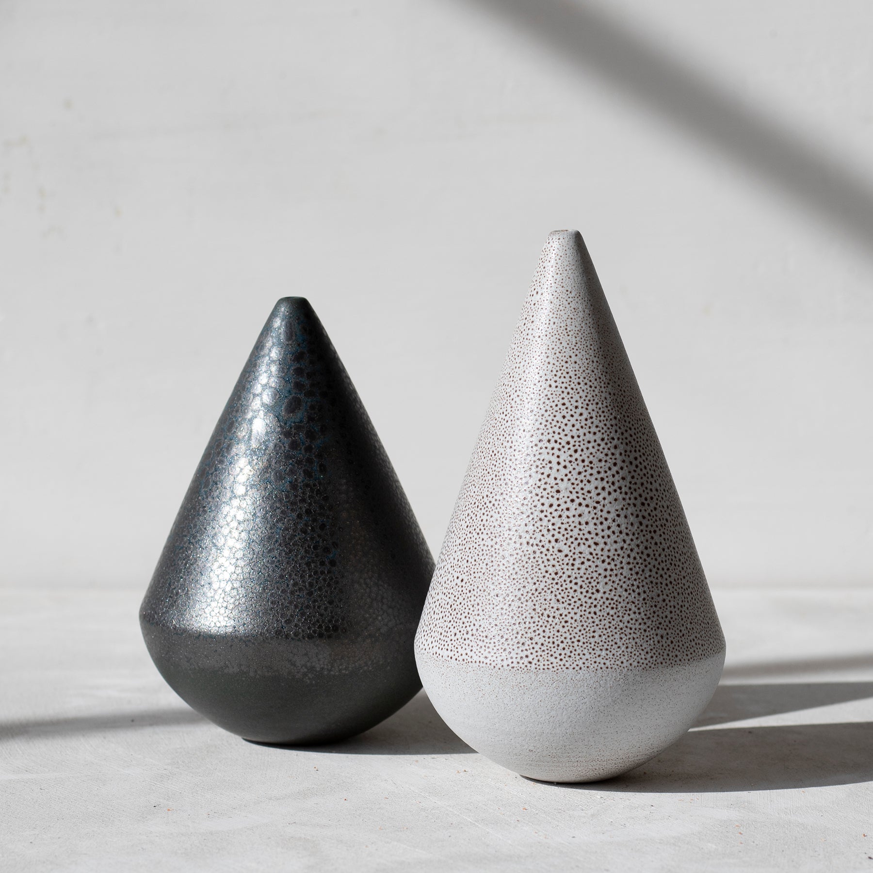 This pair sits on a spherical base that tapers elegantly to a point like buoys floating on water. A thin cutting can be held in the opening at the top. Inside each sculpture is a small ceramic bead. Pick up the piece, gently shake, and allow the twinkling sound to remind you of something you don’t want to forget. The surfaces are glazed in opposing matte shades dark and light with mottled textures reminiscent of organic objects. A beauty resulting from years of glaze research from Design Series' past.