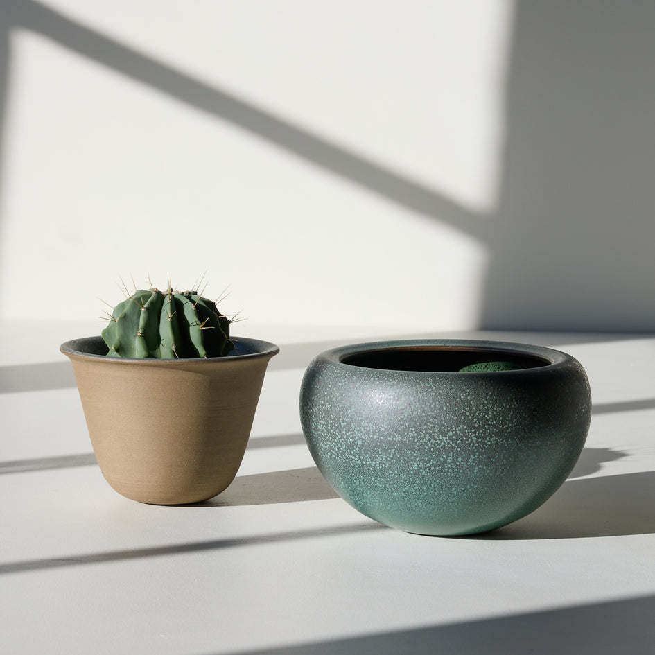 A cactus lives inside, but the form is all about softness—a small object that feels good in the hand. I can imagine myself carrying it from one sunny spot to another. In this case, I planted the cactus low in the pot not filling it with soil and sitting it at the top, as is typically seen. I want to encourage people to think differently and try new things in their own home gardens. There are more variations and creative opportunities than we imagine. — Tung Chiang