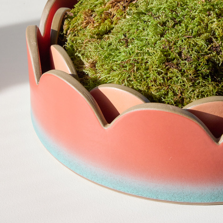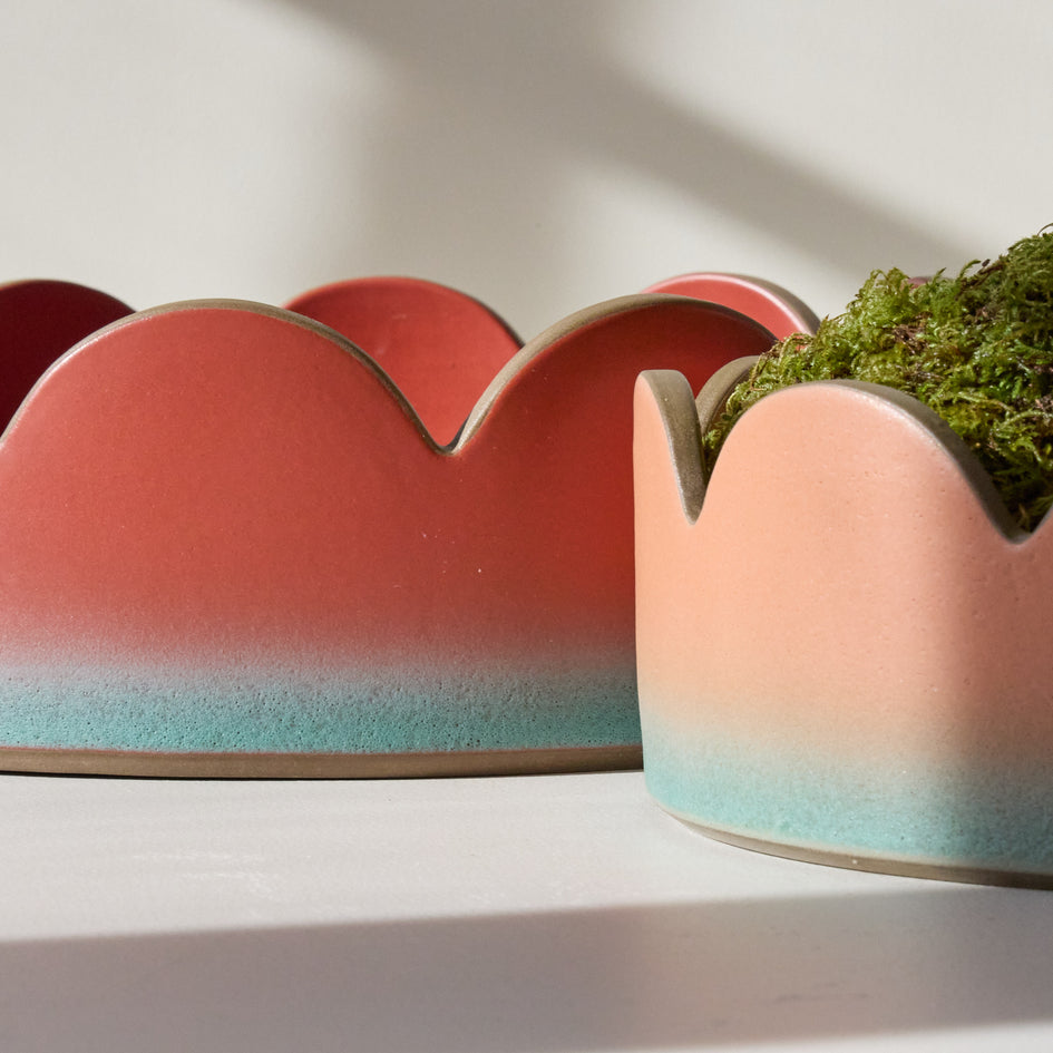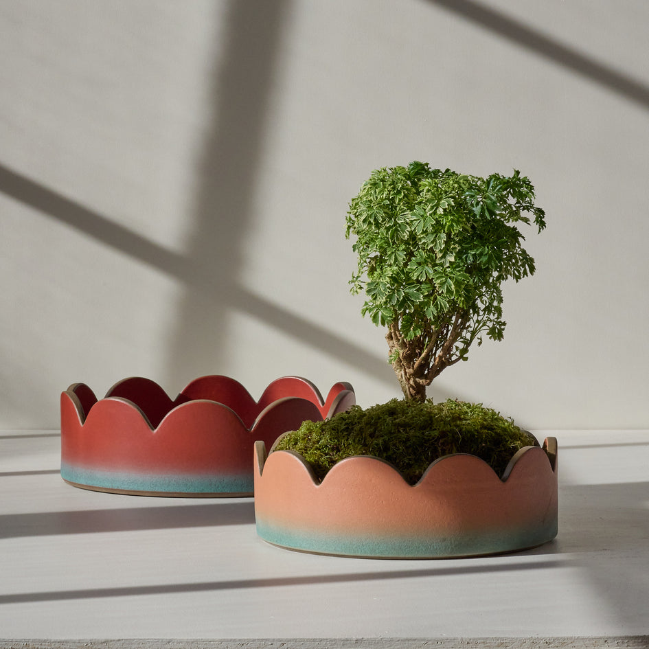 This form is like a tiny garden unto itself. It reminds me of my neighbor, a home gardener who loves and cares for her plants. The scalloped edge on this design is used twice, on both the inner and outer pots, with an unglazed edge similar to classic Heath dinnerware, which showcases our special clay. In this piece, the primary terracotta glaze is applied in a darker shade on the saucer and a lighter hue within, with a ring of blue at the base that speaks of the water that collects inside. — Tung Chiang