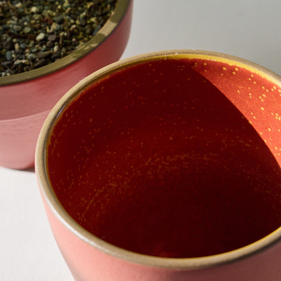 This form is a simple memory of a classic terracotta pot. The inner vessel has a conical shape and wide rim, with a rich red glaze that is partially hidden within the saucer, visible only as a wide rim above the outer form, whose glaze has more variation and shine from a gradient of orange hues and light, warm speckles. — Tung Chiang