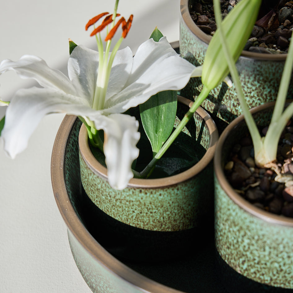 This form is designed as an interdependent group of elements. The outer tray catches and holds water; the larger two inner pieces are intended for plants that enjoy consistent humidity. The smallest cylinder is closed at the bottom, intended as a vase that lives alongside the planters to create an interplay between flowers and plants. — Tung Chiang