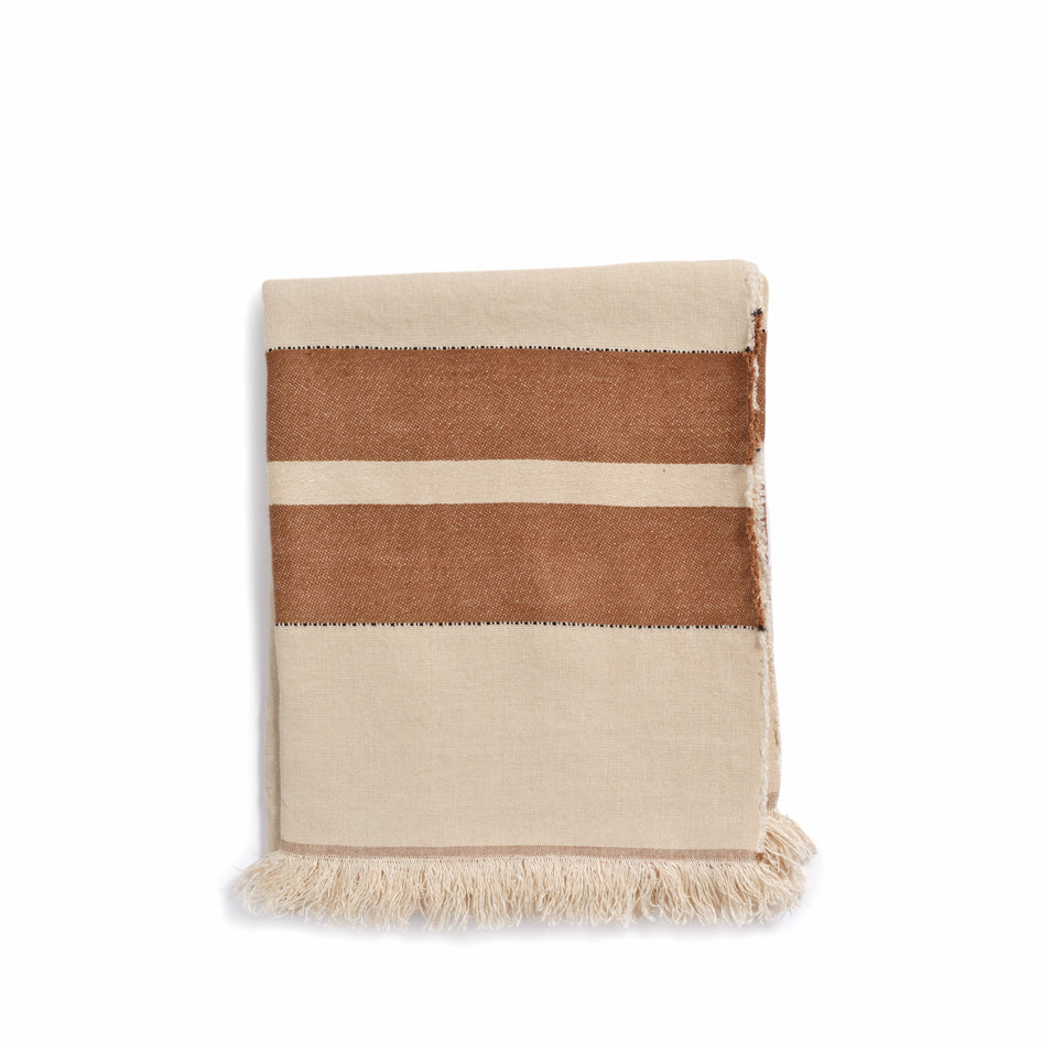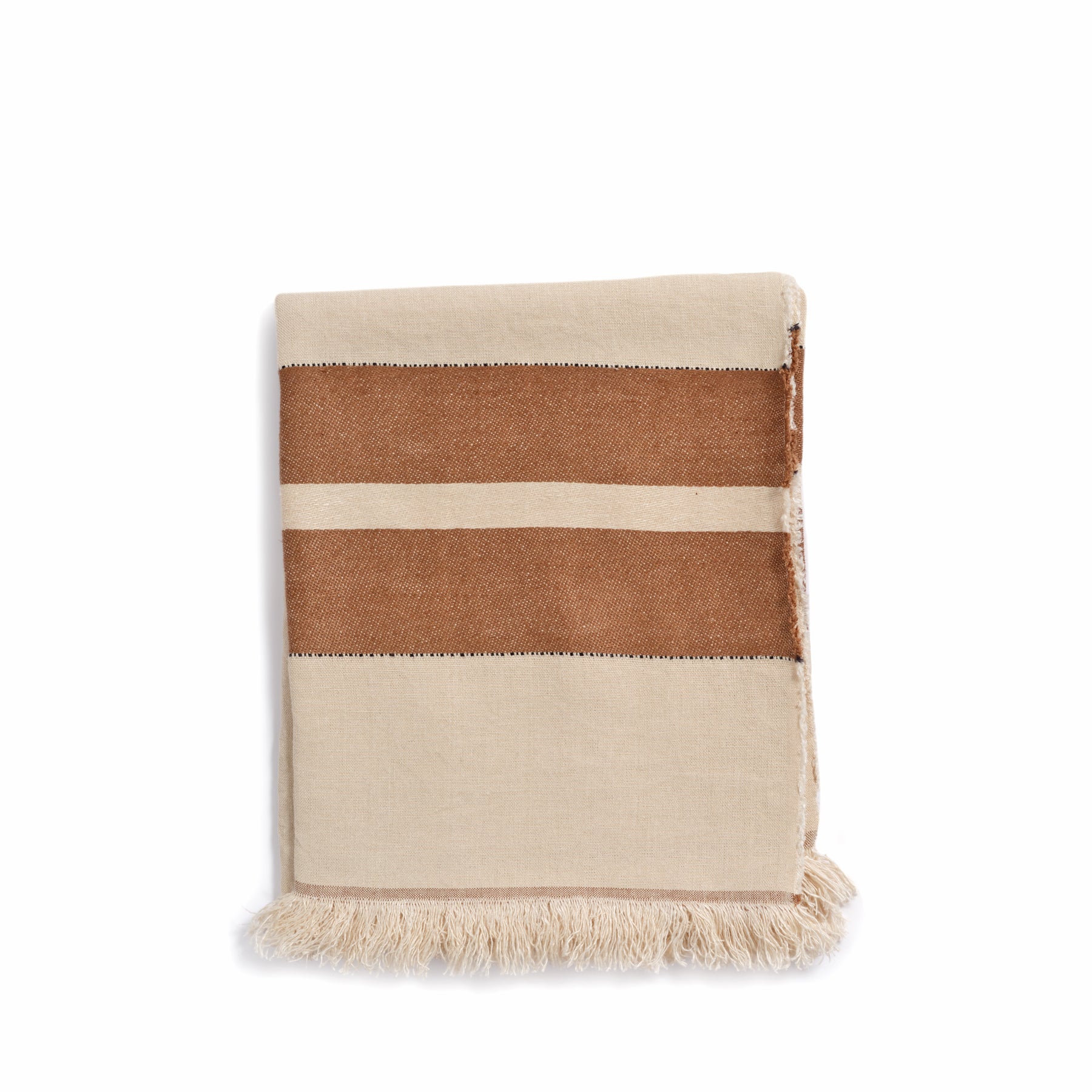 This table throw is a unique piece designed to accent your dinner table with rustic texture. There are two different stripes sitting on either end of the flax-colored ground. Both stripes are woven with leather, old-rose, spruce green, and mustard-colored threads. The body of the table throw is a sturdy plain weave finished with fringe at both ends.