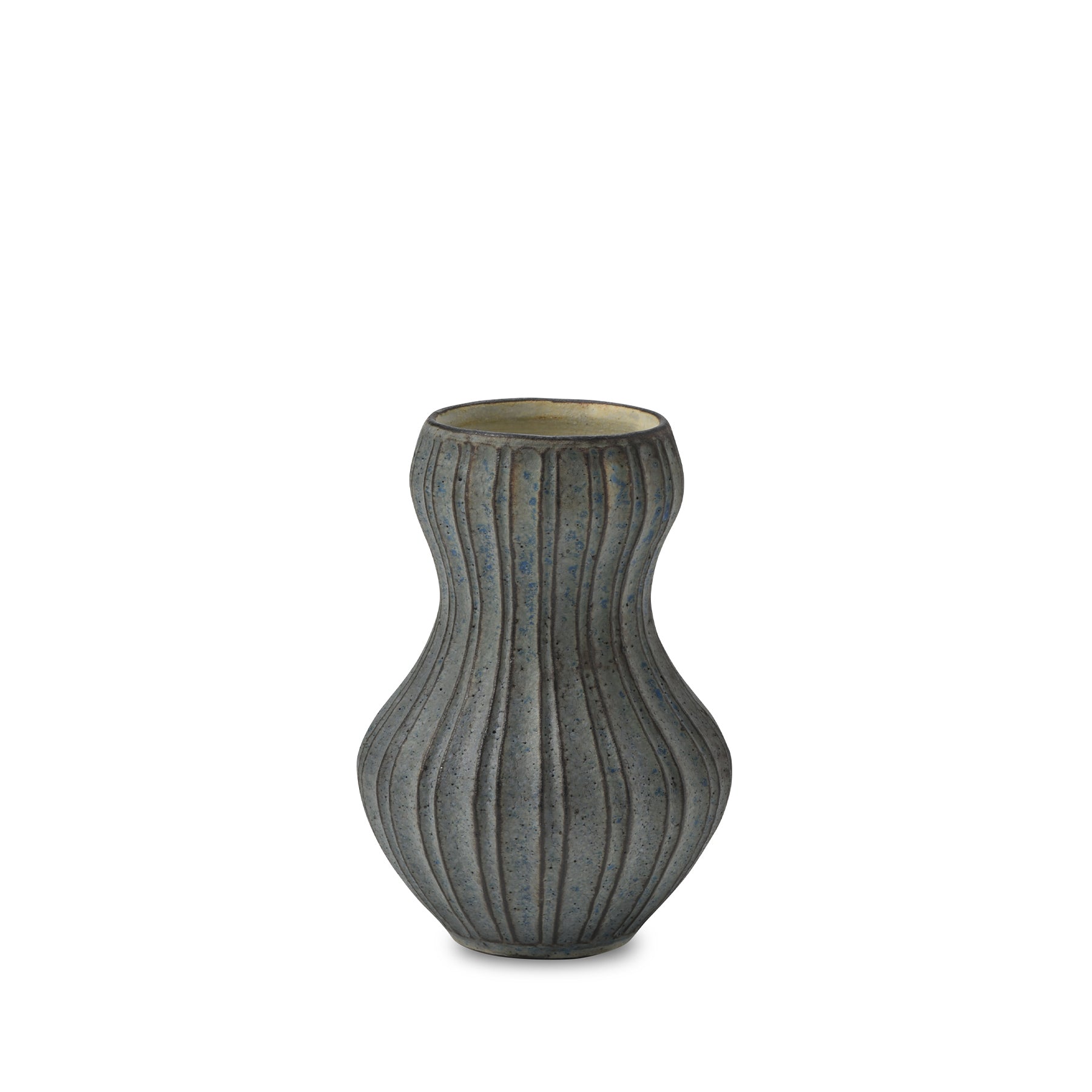 Akio Nukaga’s work explores the possibilities of how he leaves a trace of himself in clay. This piece features his signature “Pleated Work” technique of carving grooves into the wet clay after it is thrown on the wheel. The form—inspired by ancient earthenware—is accentuated by these grooves curving down the profile of the vessel creating movement and rhythm. After the first firing and before the second, he finishes the vessel by applying indigo colored slip (liquid clay). The cobalt tinged material has fascinated him since he started working with it 6 years ago and continues to pique his imagination with its endless complexity. This piece will go on sale as part of Group 2 on Wednesday July 27, 2022, at 12pm PDT.