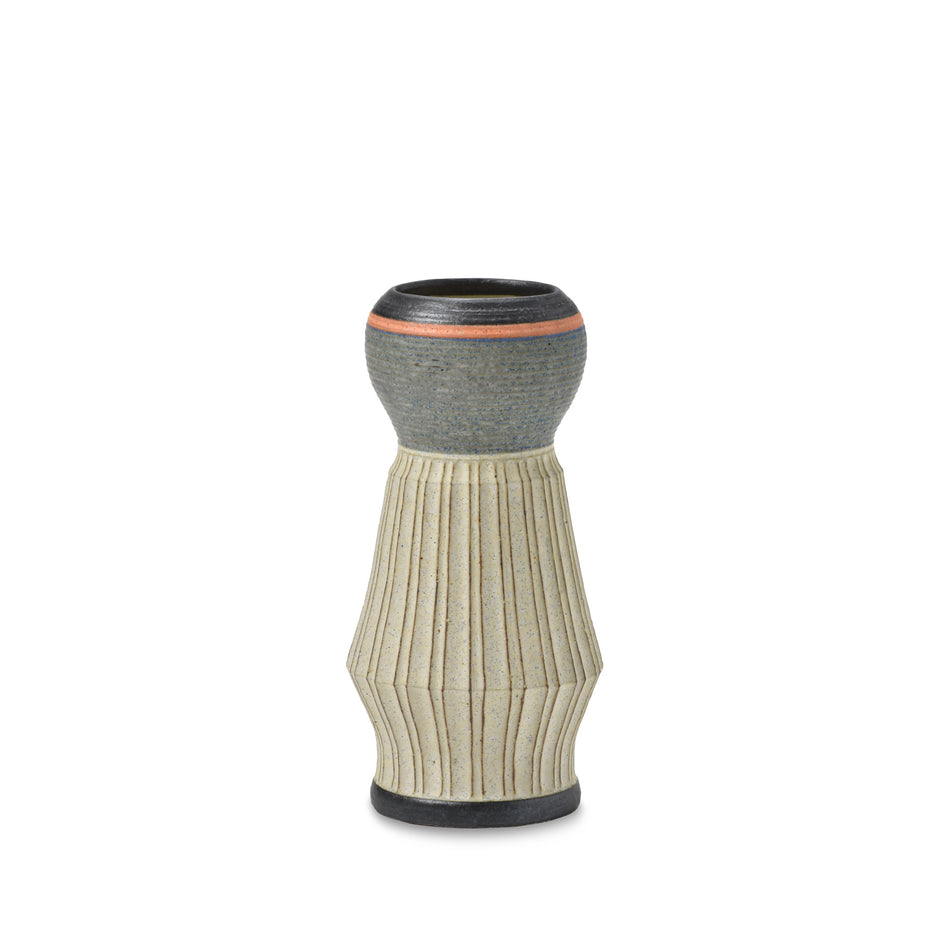 Akio Nukaga’s work explores the possibilities of how he leaves a trace of himself in clay. This piece features his signature “Pleated Work” technique of carving grooves into the wet clay after it is thrown on the wheel. The form—inspired by traditional kokeshi dolls—is accentuated by these grooves curving down the profile of the vessel creating movement and rhythm. After the first firing and before the second, he finishes the vessel by applying different colored slips (liquid clay)—a technique that he has refined over the last 30 years. This piece will go on sale as part of Group 1 on Tuesday July 26, 2022, at 9am PDT.