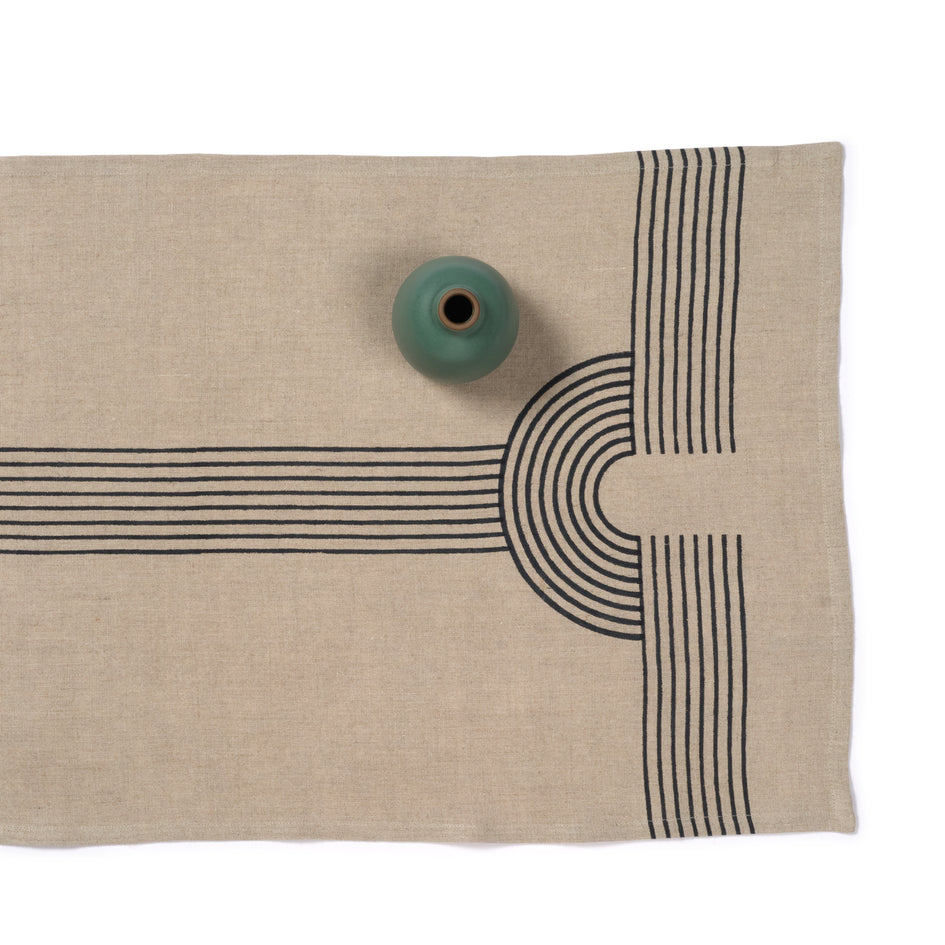 A perfect backdrop to dinnerware in a neutral palette, with a design inspired by Heath dinnerware. The striped magnet pattern is printed with dabu (mud resist) then dyed. No two textiles are exactly alike. Vase sold separately.