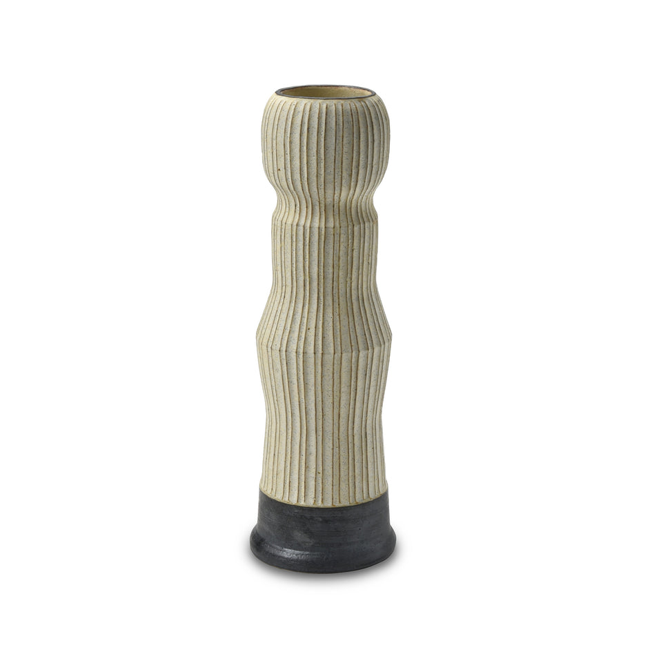 Akio Nukaga’s work explores the possibilities of how he leaves a trace of himself in clay. This piece features his signature “Pleated Work” technique of carving grooves into the wet clay after it is thrown on the wheel. The form—inspired by traditional kokeshi dolls—is accentuated by these grooves curving down the profile of the vessel creating movement and rhythm. After the first firing and before the second, he finishes the vessel by applying different colored slips (liquid clay)—a technique that he has refined over the last 30 years. This piece will go on sale as part of Group 2 on Wednesday July 27, 2022, at 12pm PDT.