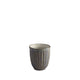 This practical tumbler still features the hallmarks of Akio's expert craftsmanship. The rim is ringed with bright yellow slip. The sides of the tumbler are carved with parallel lines that accentuate the shape of the cup. The shinogi—a traditional Japanese decorative technique—are carved carefully by hand into the surface of the piece. After bisque firing Akio applies colored slips and then glazes the pieces with translucent matte glaze. Beautiful to see and incredible to hold.