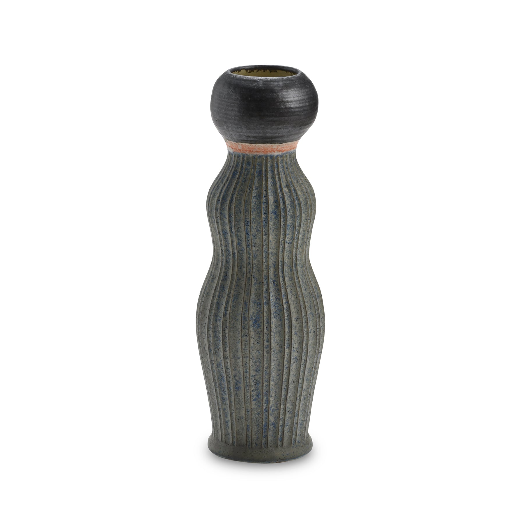 Akio Nukaga’s work explores the possibilities of how he leaves a trace of himself in clay. This piece features his signature “Pleated Work” technique of carving grooves into the wet clay after it is thrown on the wheel. The form—inspired by traditional kokeshi dolls—is accentuated by these grooves curving down the profile of the vessel creating movement and rhythm. After the first firing and before the second, he finishes the vessel by applying indigo colored slip (liquid clay). The cobalt tinged material has fascinated him since he started working with it 6 years ago and continues to pique his imagination with its endless complexity. This piece will go on sale as part of Group 1 on Tuesday July 26, 2022, at 9am PDT.