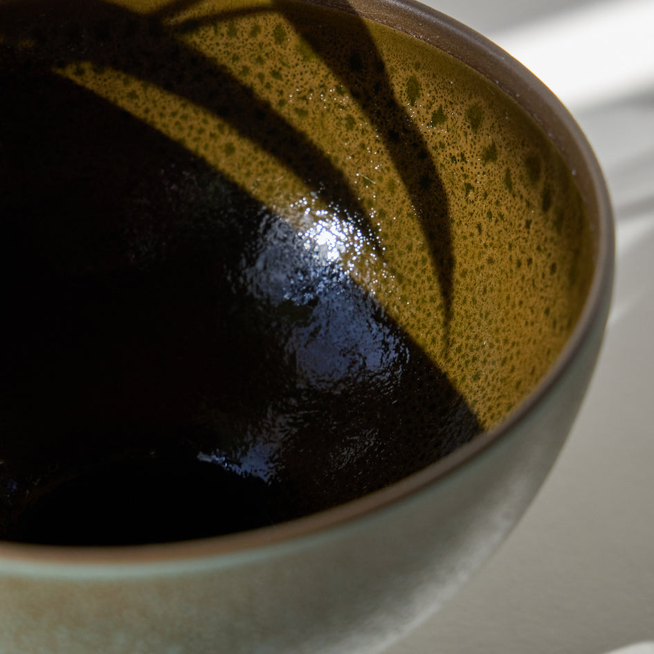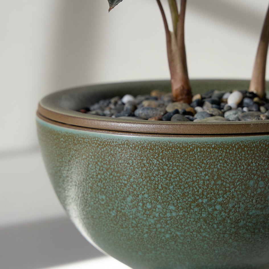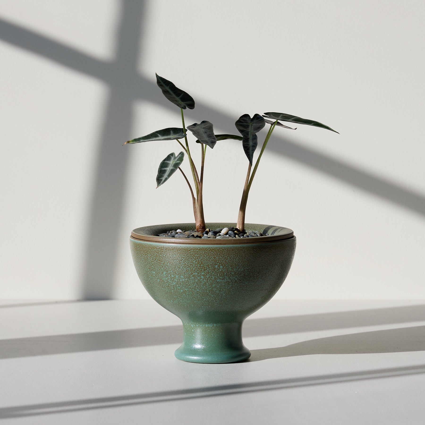 In this form, the saucer is the hero, with a pedestal foot that features more detail in its shape than many others. The green glaze follows a gradient from speckled up top, mixed with brown, down to a soothing jade at the base. The interior bowl is simple and unglazed except for the rim, which sits perfectly within the saucer and follows the glaze pattern toward the pebbles inside. — Tung Chiang