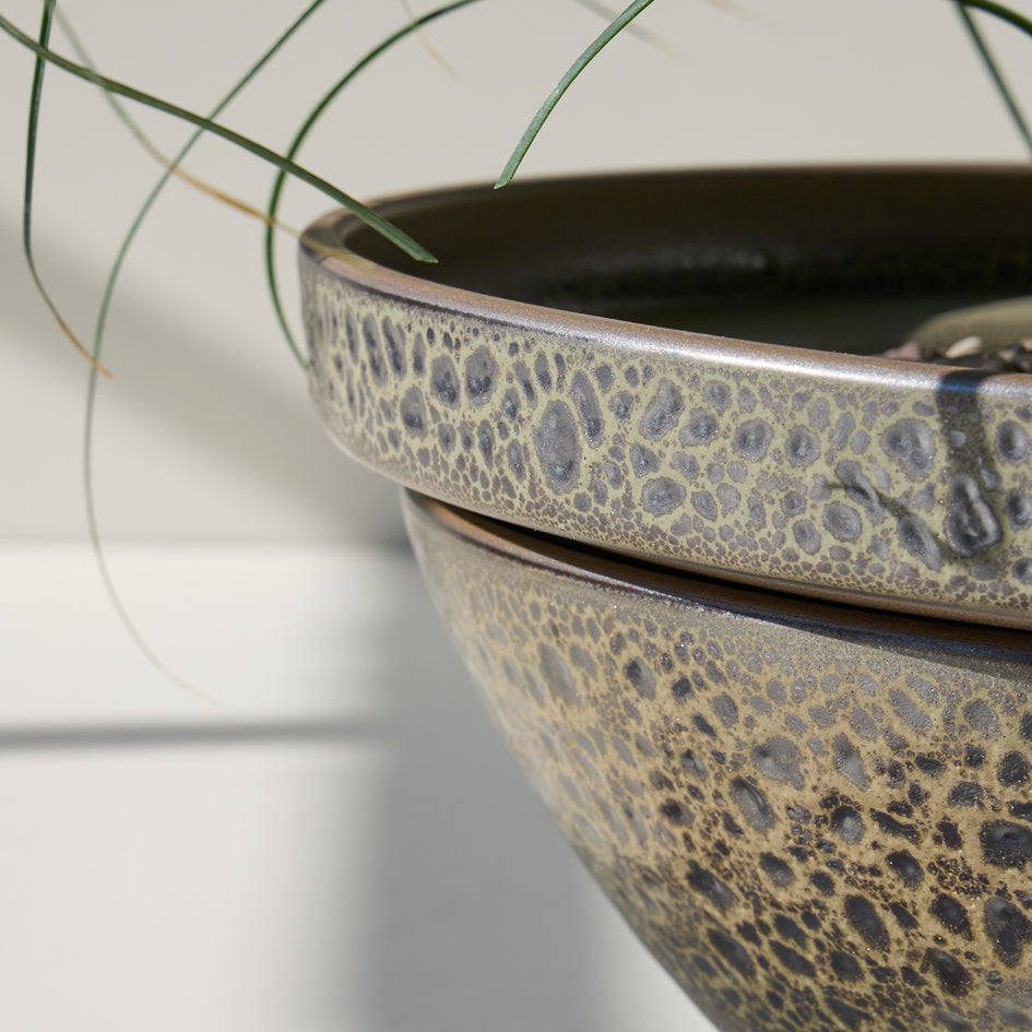 The round proportions of this form echo the classic Heath shallow serving bowl, both of which sit comfortably in the hands, and elegantly on a table or counter. The interior bowl has a wide rim that extends slightly over the saucer, making it easy to lift and remove. The surface pattern comes from two Heath glazes—KPFA and Gunmetal—layered over one another before reacting to the firing temperature in the kiln. — Tung Chiang