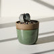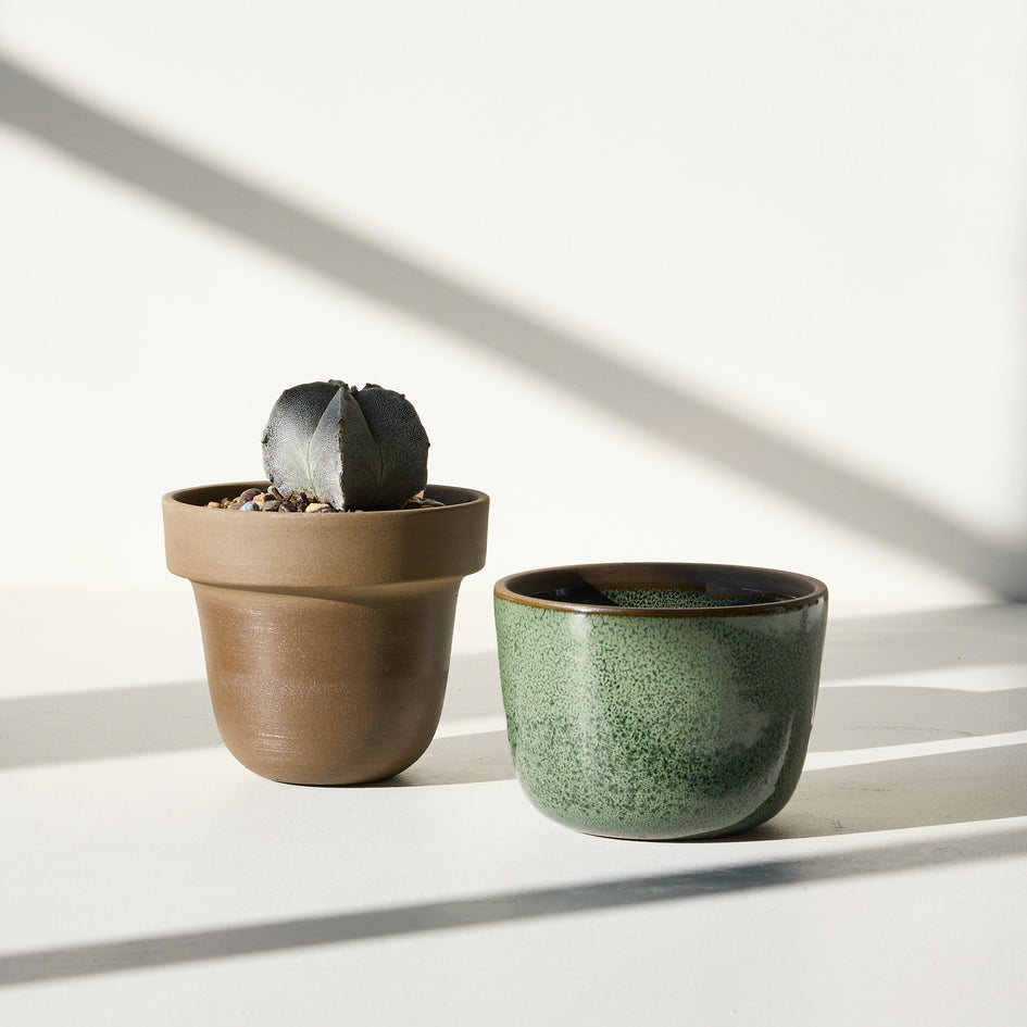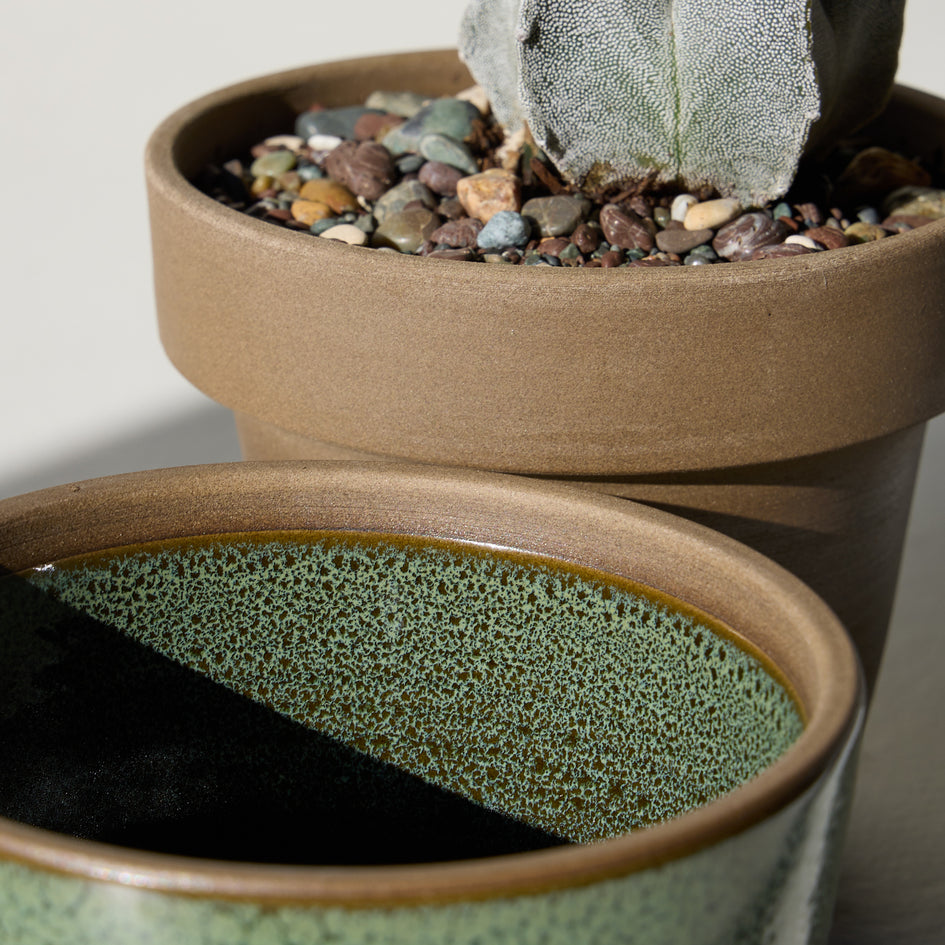 This design is about simplicity and humble beauty. The interior planter is entirely unglazed, showing the color of the earth. Without glaze, the surface is more porous, enabling water to evaporate gently through the walls and keep the soil healthy for a dry-climate plant like a succulent or cactus. The wide rim of the inner bowl rests flush on the unglazed rim of the outer saucer, which has a soft green glaze with a gradient of brown speckles. — Tung Chiang