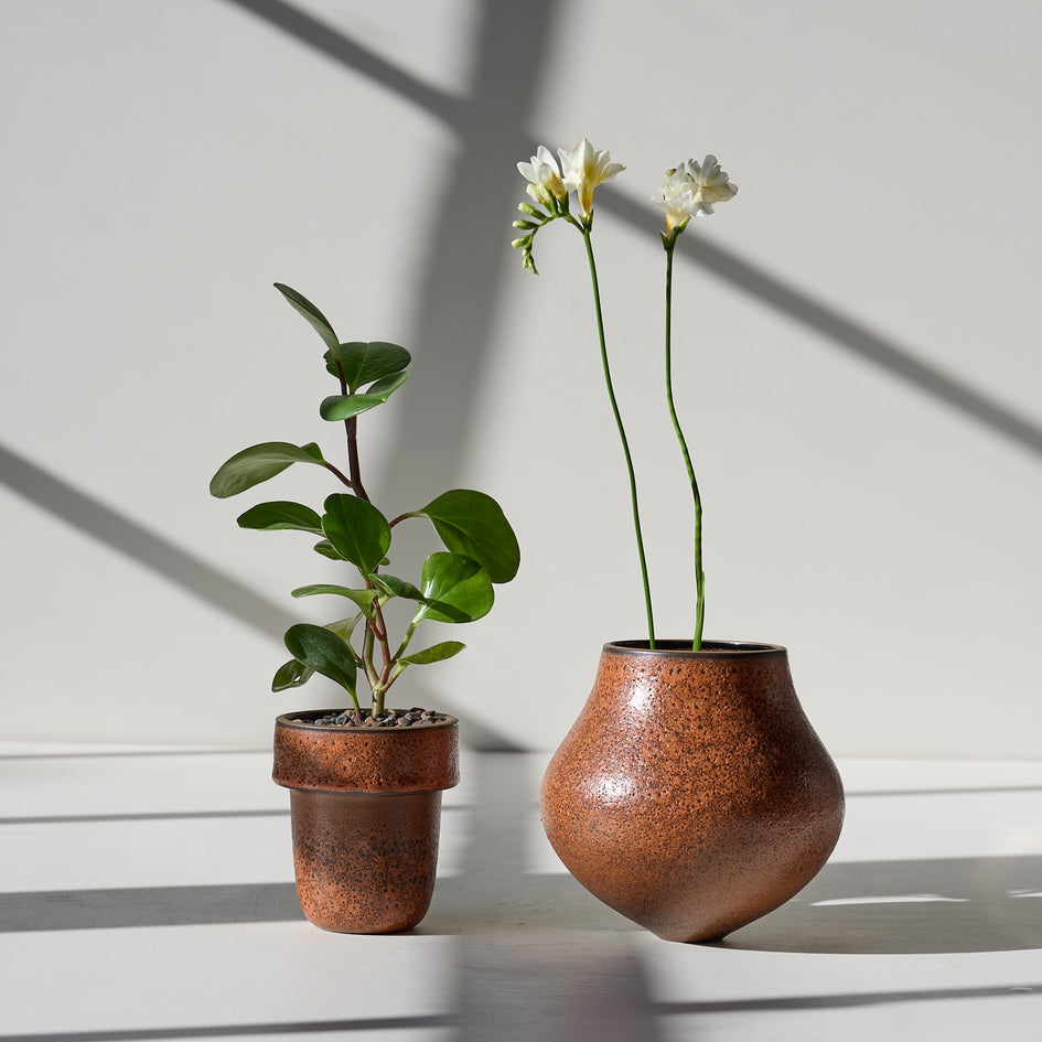 Inside the round-bodied exterior vase, the plant pot within is slightly tapered, with a wide rim. I wanted to give the roots of the plant equal room from top to bottom so they wouldn’t be trapped in a tight space as they grow. The inner pot drains into the exterior vessel, which can also be used as a vase. The small foot at the base of the saucer gives the form a sense of lift and a profile reminiscent of a water drop. — Tung Chiang