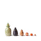 A cornucopia of fruits hides inside this matryoshka. An apricot hides inside a mandarin orange inside an apple inside a pear inside a bunch of grapes inside of the pineapple. Each are hand made and hand painted in Russia by craftspeople who specialize in this traditional art.