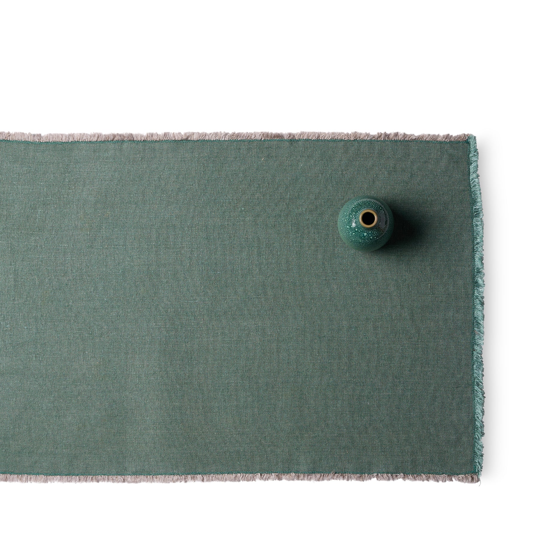 Each runner is made from beautiful, yarn-dyed linen with a luxurious hand. The fabric is woven on vintage shuttle looms by a duo of craftswomen in Italy. The warp and weft threads are dyed slightly different colors resulting in a visually textured quality to the fabric and different colored fringe on opposite edges.