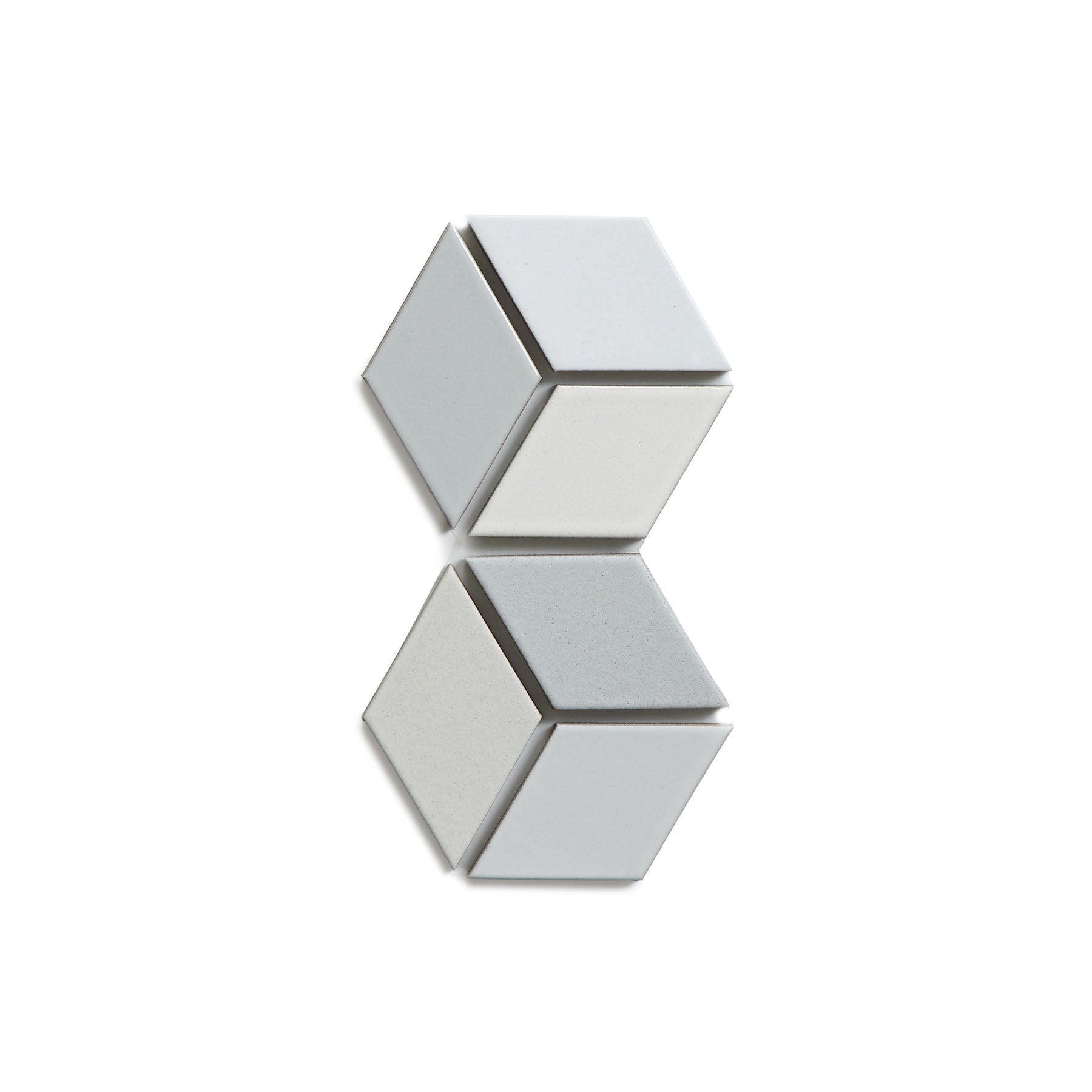 The Mural collection is a series of pre-configured patterns in curated colorways. The Twill pattern uses diamond shaped tiles in contrasting glazes which produces a pattern of cubes. Up-close, the individual cubes highlight the relationship between tonal glazes in our palette. When stepping back, a rhythm begins to appear between the larger swaths of color and value. The Snowdrift colorway consists of Powder, White Pumice, Buckwheat, Polo Grey, Moon, and Alpine. Up to one tile sample kit may be ordered online.