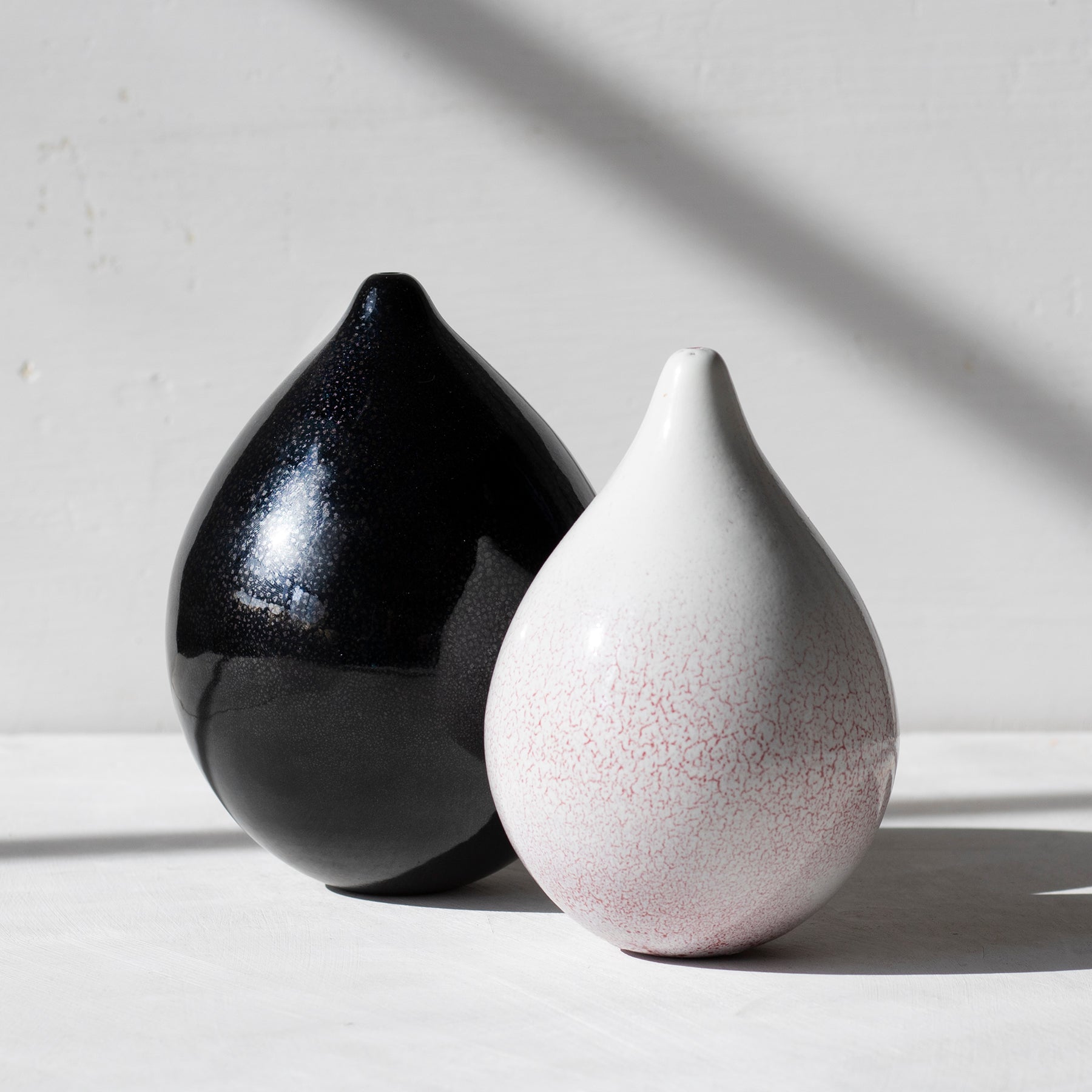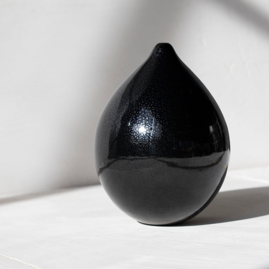 This pair shines like drops of onyx and alabaster. Inside these sculptures are small ceramic beads: the dark piece has one while the light piece has three making it the most lively of the collection. Pick them up, gently shake, and allow the twinkling sound to remind you of something you don’t want to forget. The surfaces are glazed in high gloss, the dark glaze revealing depth like an antique mirror and the light glaze is opaque yet bright. A beauty resulting from years of glaze research from Design Series' past.