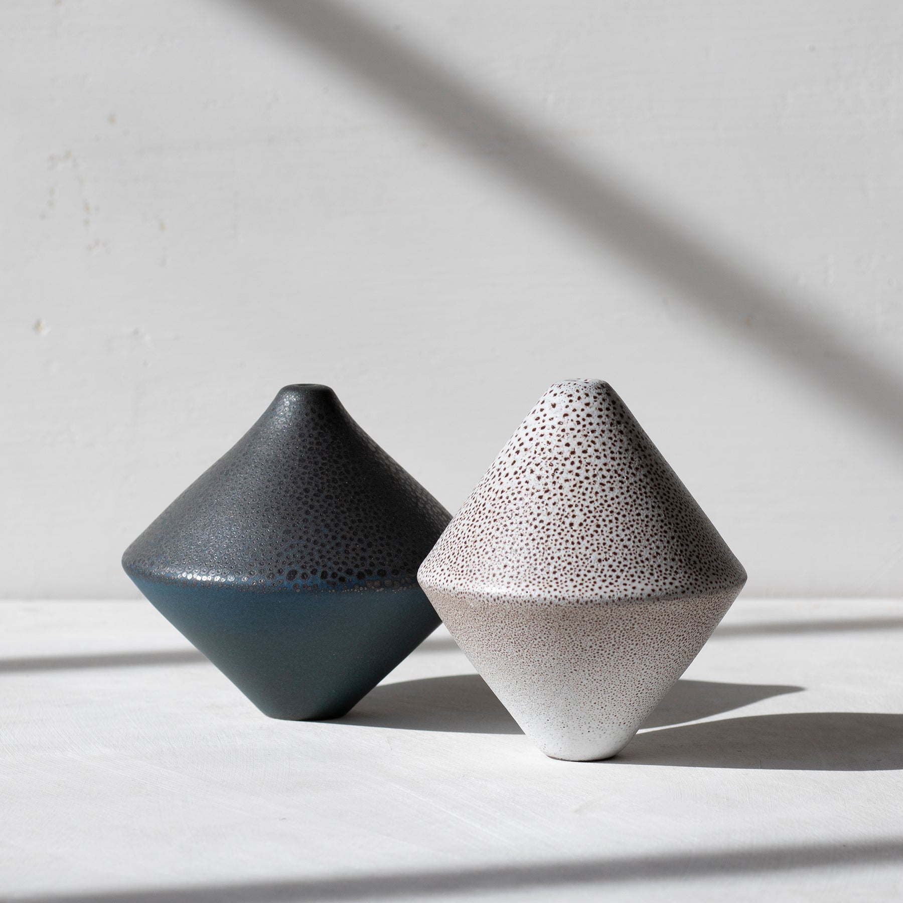 A pair of diamond profiles spun on their axes. Inside each sculpture is a small ceramic bead. Pick up the piece, gently shake, and allow the twinkling sound to remind you of something you don’t want to forget. The surfaces are glazed in opposing matte shades dark and light with mottled textures reminiscent of organic objects. A beauty resulting from years of glaze research from Design Series' past.