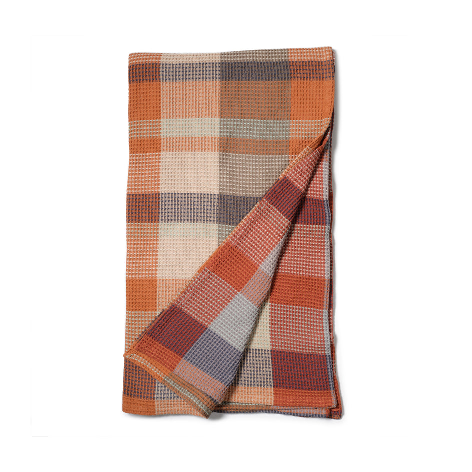 The classic waffle weave has a cellular structure which gives the Vrou-Vrou a chunky body and texture. The pure cotton yarn ensures that it remains light and breathable, perfect for year round luxury. This queen sized blanket is made to cover a bed, but it's also great for an evening stroll or marking your spot by the lake. Each Vrou-Vrou is woven with 9 different coloured yarns into a plaid check design by Lenore Schroeder.